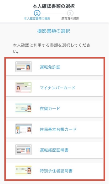 下画像赤枠内から撮影できる書類を選択してクリックします。