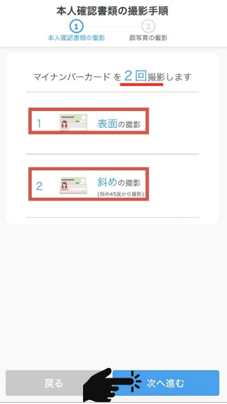 マイナンバーですと裏面の撮影がないので、正面と斜めだけの撮影になります。