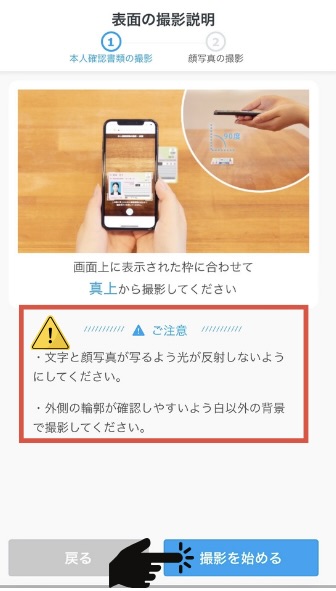 下画像赤枠内に表面の撮影の注意点が書いてあるので読んでから下の撮影を始めるをクリックして撮影を始めます。