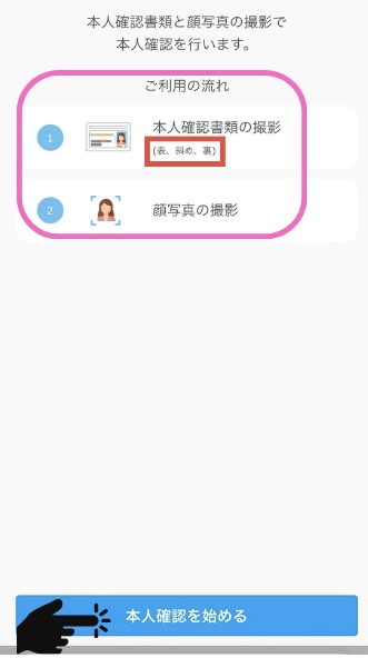 下画像の下の指マークの本人確認を始めるをクリックします。