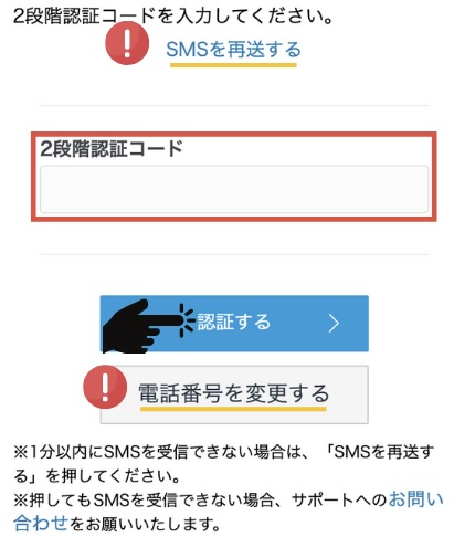 SMSを再送したい方や電話番号を変更したい方は下画像黄色下線のところをクリックして進めてください。